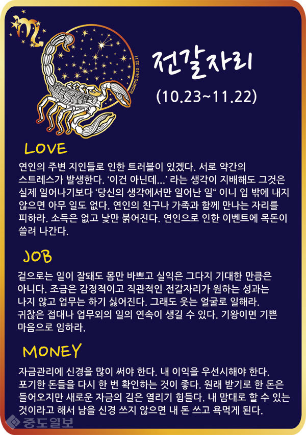 겉으로는 일이 잘돼도 몸만 바쁘고 실익은 그다지 기대한 만큼은 아니다. 조금은 감정적이고 직관적인 전갈자리가 원하는 성과는 나지 않고 업무는 하기 싫어진다. 그래도 웃는 얼굴로 일해라. 귀찮은 접대나 업무외의 일의 연속이 생길 수 있다. 기왕이면 기쁜 마음으로 임하라.