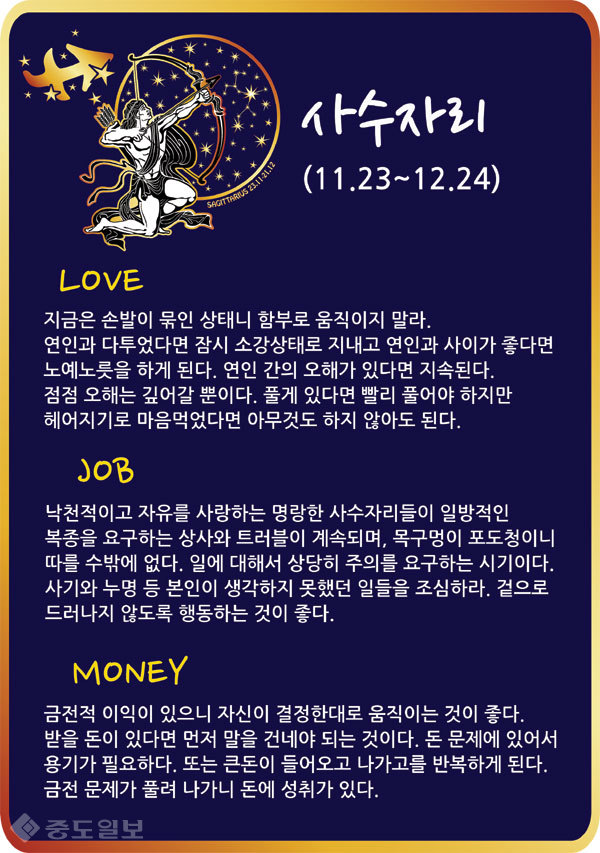 낙천적이고 자유를 사랑하는 명랑한 사수자리들이 일방적인 복종을 요구하는 상사와 트러블이 계속되며, 목구멍이 포도청이니 따를 수밖에 없다. 일에 대해서 상당히 주의를 요구하는 시기이다. 사기와 누명 등 본인이 생각하지 못했던 일들을 조심하라. 겉으로 드러나지 않도록 행동하는 것이 좋다.