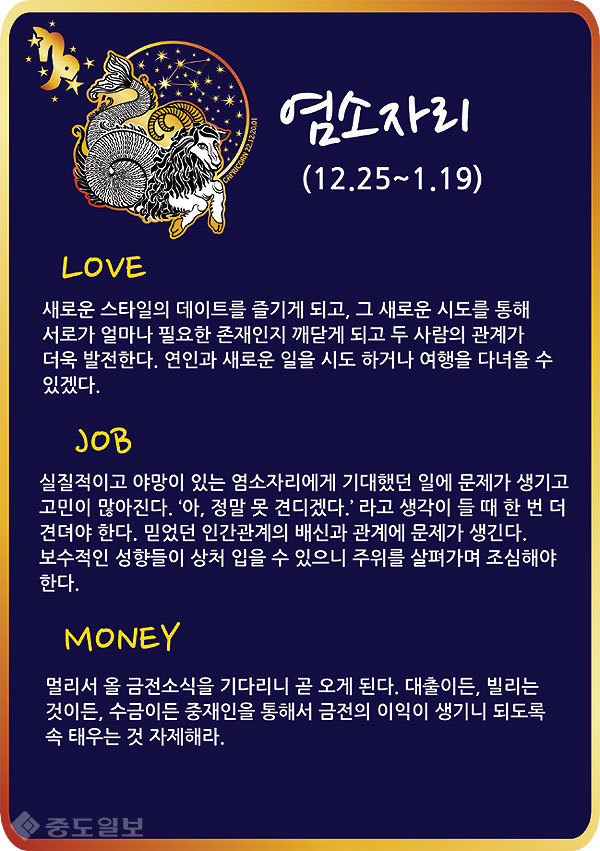 실질적이고 야망이 있는 염소자리에게 기대했던 일에 문제가 생기고 고민이 많아진다. ‘아, 정말 못 견디겠다.’ 라고 생각이 들 때 한 번 더 견뎌야 한다. 믿었던 인간관계의 배신과 관계에 문제가 생긴다. 보수적인 성향들이 상처 입을 수 있으니 주위를 살펴가며 조심해야 한다.