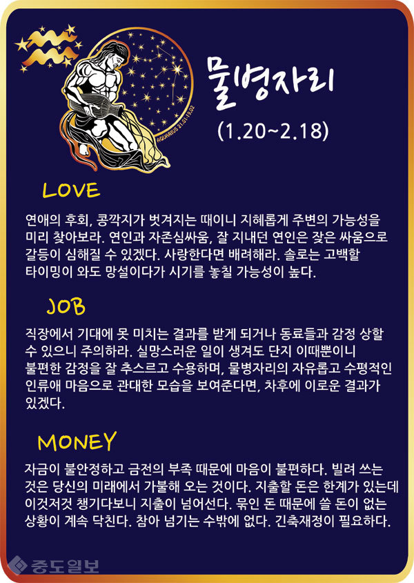 직장에서 기대에 못 미치는 결과를 받게 되거나 동료들과 감정 상할 수 있으니 주의하라. 실망스러운 일이 생겨도 단지 이때뿐이니 불편한 감정을 잘 추스르고 수용하며, 물병자리의 자유롭고 수평적인 인류애 마음으로 관대한 모습을 보여준다면, 차후에 이로운 결과가 있겠다.