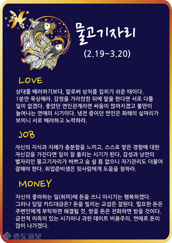 자신의 지식과 지혜가 충분함을 느끼고, 스스로 쌓은 경험에 대한 자신감을 가진다면 일이 잘 풀리는 시기가 된다. 감성과 낭만의 별자리인 물고기자리가 바쁘고 숨 쉴 틈 없으니 자기관리도 더불어 잘해야 한다. 취업준비생은 윗사람에게 도움을 청하라.