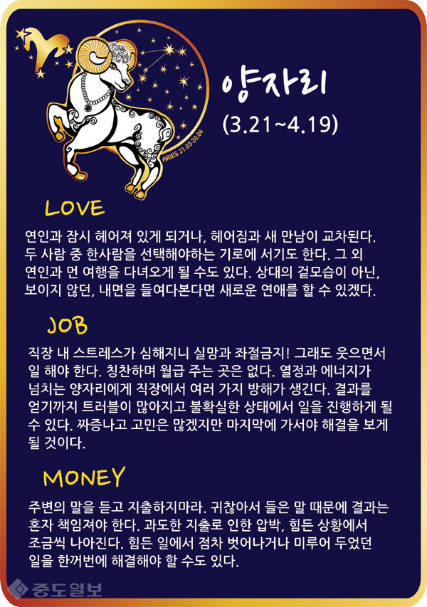 직장 내 스트레스가 심해지니 실망과 좌절금지! 그래도 웃으면서 일 해야 한다. 칭찬하며 월급 주는 곳은 없다. 뜨거운 열정과 에너지가 넘치는 양자리에게 직장에서 여러 가지 방해가 생긴다. 결과를 얻기까지 트러블이 많아지고 불확실한 상태에서 일을 진행하게 될 수 있다. 짜증나고 고민은 많겠지만 마지막에 가서야 해결을 보게 될 것이다.