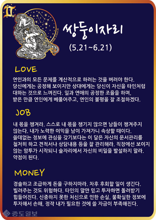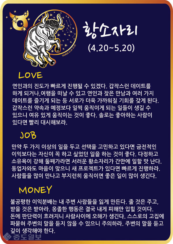 만약 두 가지 이상의 일을 두고 선택을 고민하고 있다면 금전적인 이익보다는 자신이 꼭 하고 싶었던 일을 하는 것이 좋다. 다정하고 소유욕이 강해 둘째가라면 서러운 황소자리가 간만에 일할 맛 난다. 동업자와도 마음이 맞으니 새로운 프로젝트가 있다면 빠르게 진행하라. 사람들을 많이 만나고 부지런히 움직이면 좋은 일이 많이 생길 것이다.