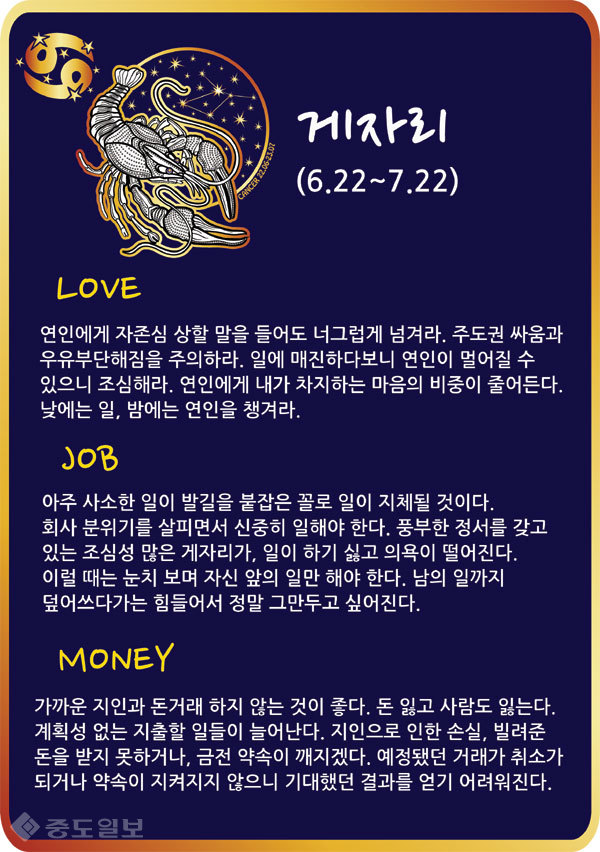 아주 사소한 일이 발길을 붙잡은 꼴로 일이 지체될 것이다. 회사 분위기를 살피면서 신중하게 일해야 한다. 풍부한 정서를 갖고 있는 조심성 많은 게자리가, 일이 하기 싫고 의욕이 떨어진다. 이럴 때는 눈치 보며 자신 앞의 일만 해야 한다. 남의 일까지 덮어쓰다가는 힘들어서 정말 그만두고 싶어진다.