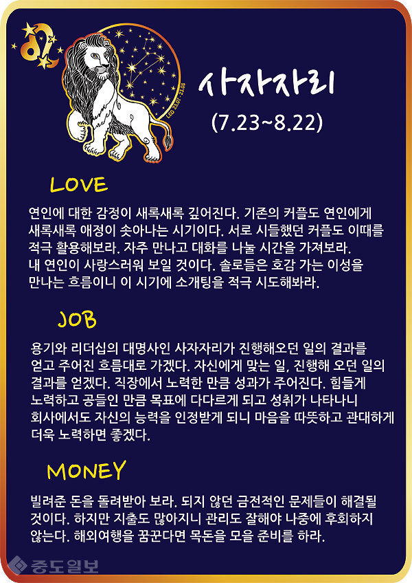 용기와 리더십의 대명사인 사자자리가 진행해오던 일의 결과를 얻고 주어진 흐름대로 가겠다. 자신에게 맞는 일, 진행해 오던 일의 결과를 얻겠다. 직장에서 노력한 만큼 성과가 주어진다. 힘들게 노력하고 공들인 만큼 목표에 다다르게 되고 성취가 나타나니 회사에서도 자신의 능력을 인정받게 되니 마음을 따뜻하고 관대하게 더욱 노력하면 좋겠다.