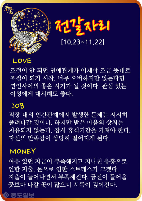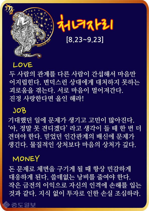 돈 문제로 스트레스 받을 일이 생기니 너무 시야를 좁히지 말고 편안하게 상황을 받아들이는 것이 좋다. 큰돈은 아니지만 쓰고 싶지 않은 곳에 지출이 생긴다. 경조사비등으로 나갈 돈이 많아질 것, 인간관계를 생각하면 안 낼 수도 없으니 불필요한 소비지출을 줄이는 것이 현명하다.