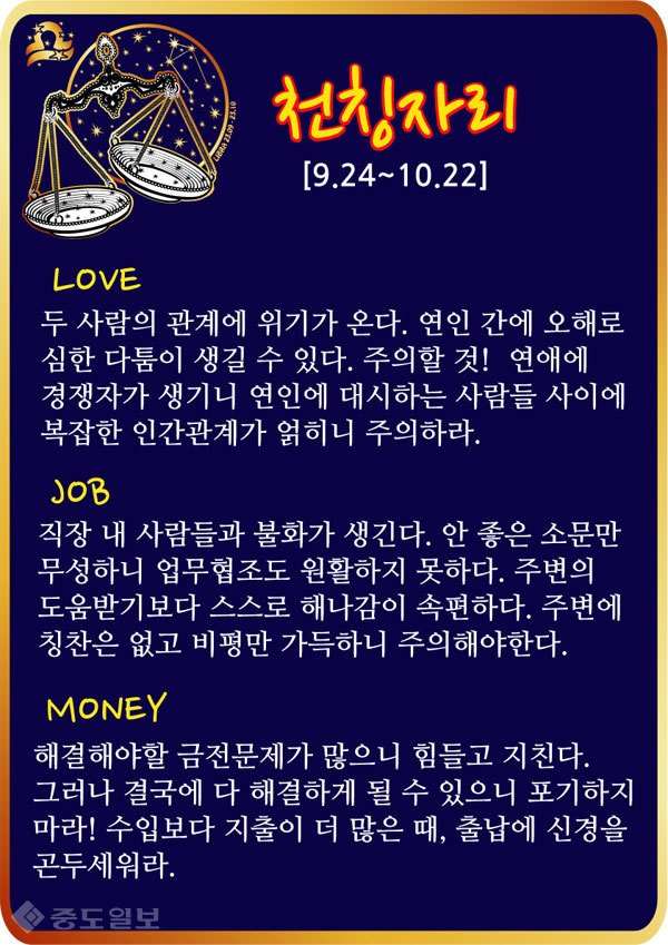 직장 내 사람들과 불화가 생긴다. 이래저래 안 좋은 소문만 무성하니 업무협조도 원활하지 못하다. 주변도움받기보다 스스로 해나감이 속편하다. 잘 유지해온 거래처도 문제가 생길 수 있으니 살펴봐라. 주변에 칭찬은 없고 비평만 가득하니 조금은 주의해야한다.