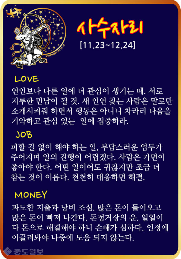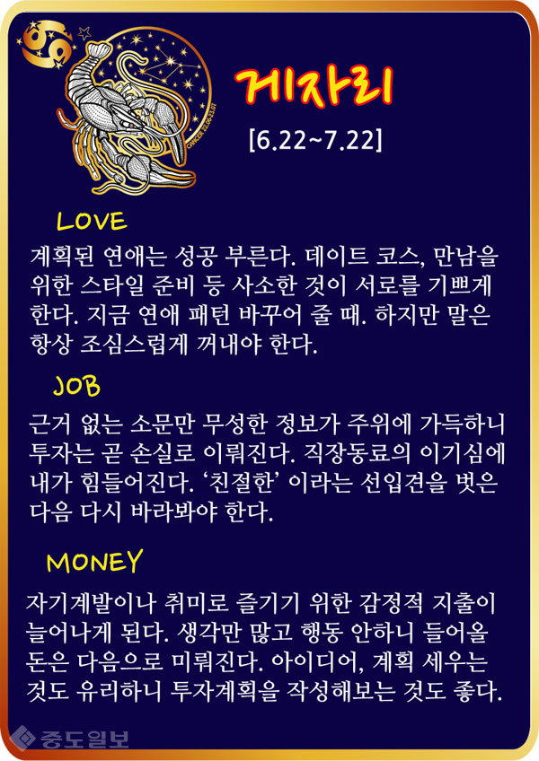 충동구매의 유혹이 저축의 마음을 이길 수밖에 없나보다. 지출을 억제해야 하지만 잘 되지 않는다. 돈 문제가 인간관계의 문제로 심화된다. 함부로 판단하고 기분대로 말하지 않는 것이 미래를 위해 좋다. 들어오기로 한 금전에서 좋지 않은 소식이 들려온다. 돈과 관련해 좋지 않은 일들이 작게 일어나니 주의할 것!