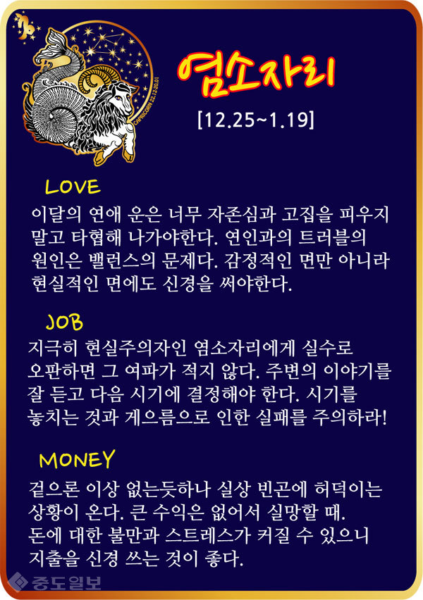 지극히 현실주의자인 염소자리에게 실수로 오판하면 그 여파가 적지 않다. 주변의 이야기를 잘 듣고 다음 시기에 결정해야 한다. 망설임이 많고 이럴까 저럴까 일에 대해 확실한 신념이 바로서지 않는다면 판단을 유보하는 것이 좋다. 시기를 놓치는 것과 게으름으로 인한 실패를 주의하라!