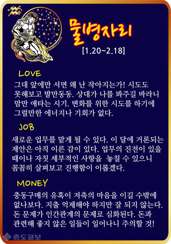 그대 앞에만 서면 왜 난 작아지는가! 시도도 못해보고 발만동동..상대가 나를 봐주길 바라니 맘만 애타는 시기. 상대에게 매달려 있는 때, 변화를 위한 시도를 하기에 그럴만한 에너지나 기회가 없다. 인내하고 기다린다면 연애문제는 자연스럽게 좋은 방향으로 해결된다.