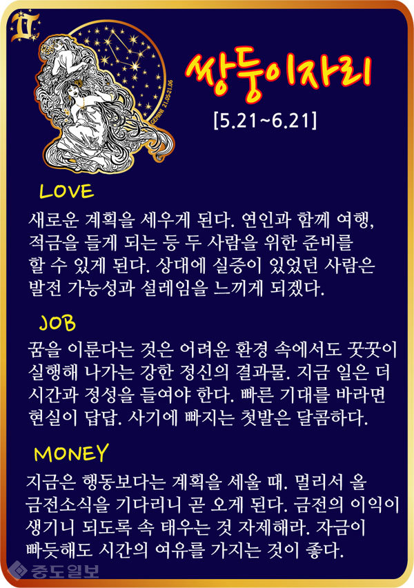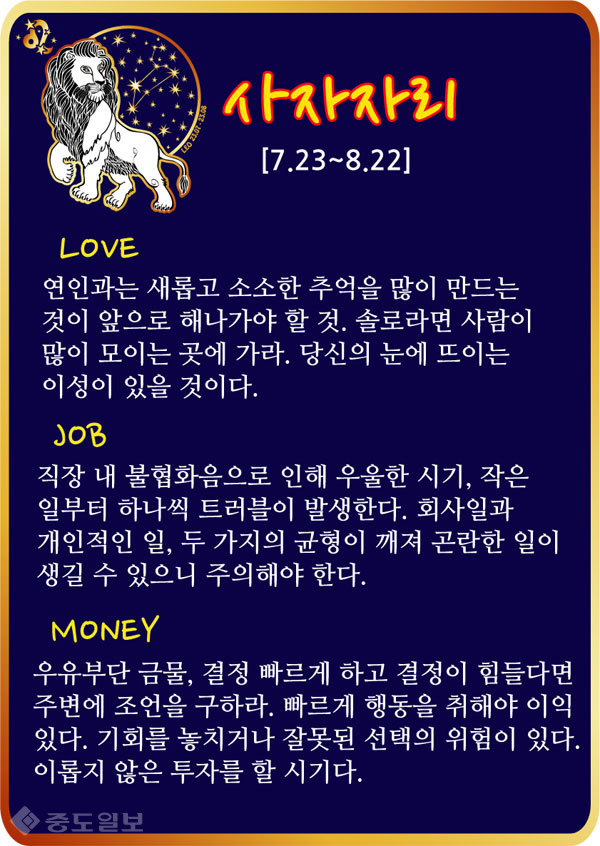 계획된 연애는 성공을 부른다. 데이트 코스, 만남을 위한 스타일 준비등 사소한 것이 서로를 기쁘게 한다. 지금은 연애의 패턴을 바꾸어 줄 때가 되었거나 새로운 관계변화를 가져야 할 때이다. 하지만 말은 항상 조심스럽게 꺼내야 한다.