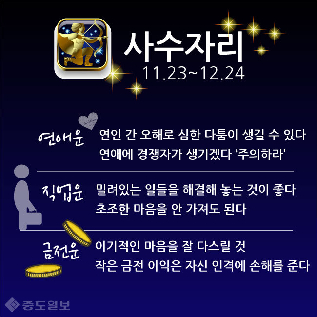 연인 간 오해로 심한 다툼이 생길 수 있다. 연애에 경쟁자가 생기겠다. ‘주의하라’