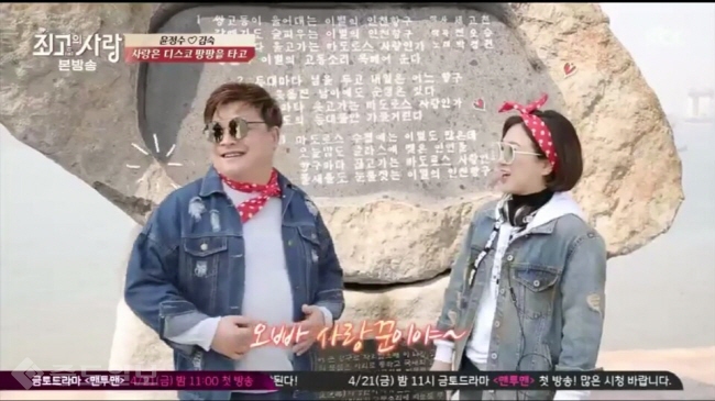 JTBC 예능 프로그램 ‘님과 함께 시즌2-최고의 사랑’에 출연 중인 윤정수와 김숙이 청청 패션으로 복고여행 봄나들이게 나섰다. 이번 촬영은 연인들의 필수코스로 손꼽히고 있는 월미도의 놀이공원에서 데이트를 즐겼다. 이번 복고 여행은 일회용필름카메라까지 준비하면서 둘만의 추억 사진을 담기도 했다.