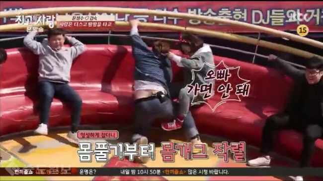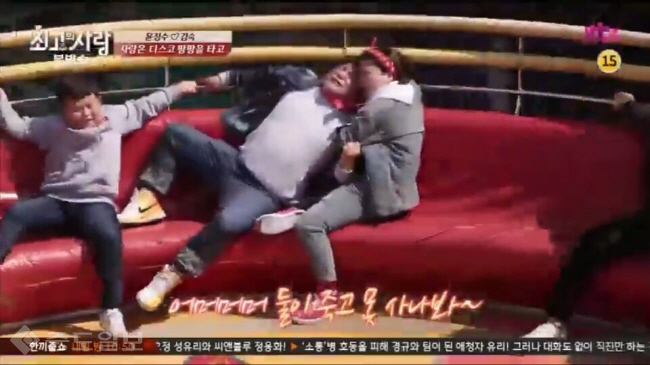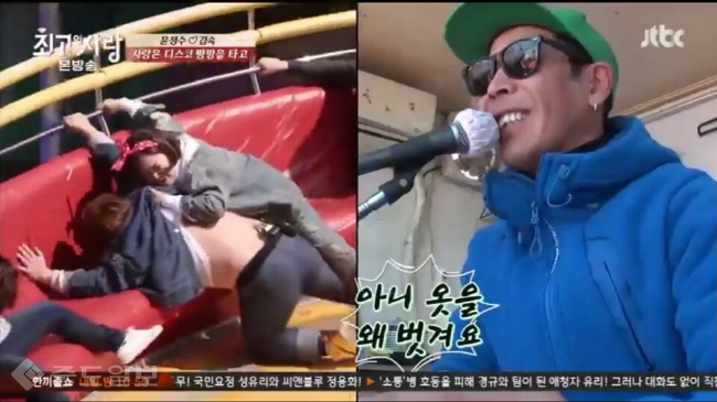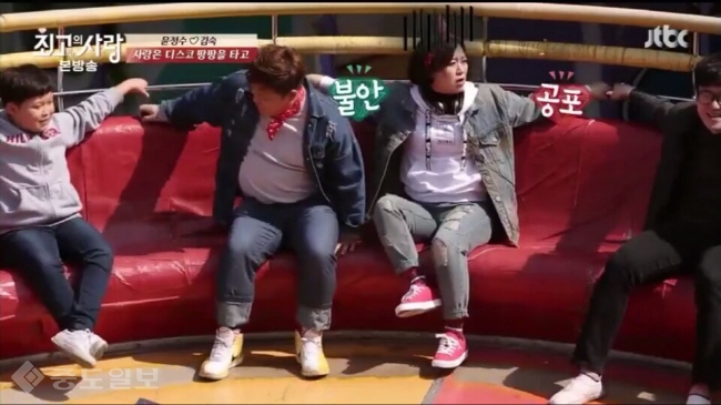결국 빠른 스피드에 둘은 더 가까이 밀착이 되었지만 그 시간도 잠시뿐. 윤정수가 속도를 이기지 못하고 자리에서 떨어지려고 하자 김숙은 있는 힘을 다해 윤정수를 잡아야만 했고, 그의 바지를 끌어 올리면서 윤정수의 처절함을 생생히 느낄 수 있었다. 뉴미디어부 김종남 기자