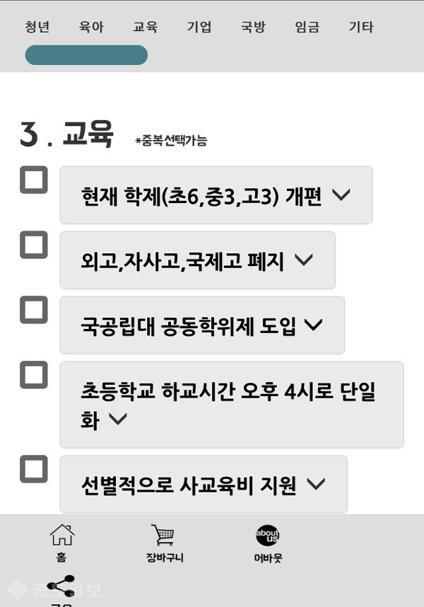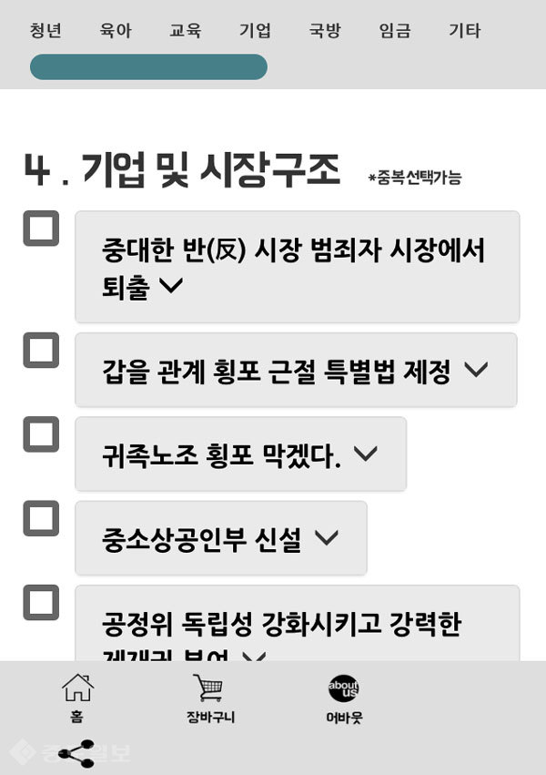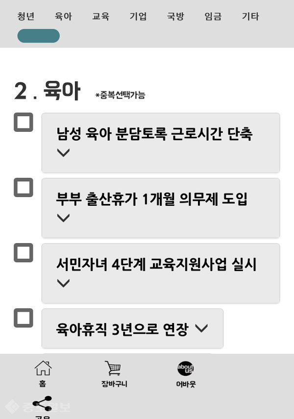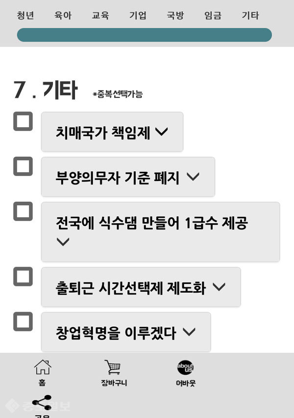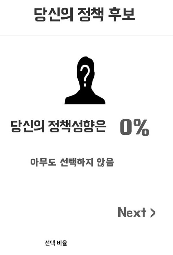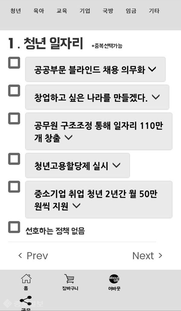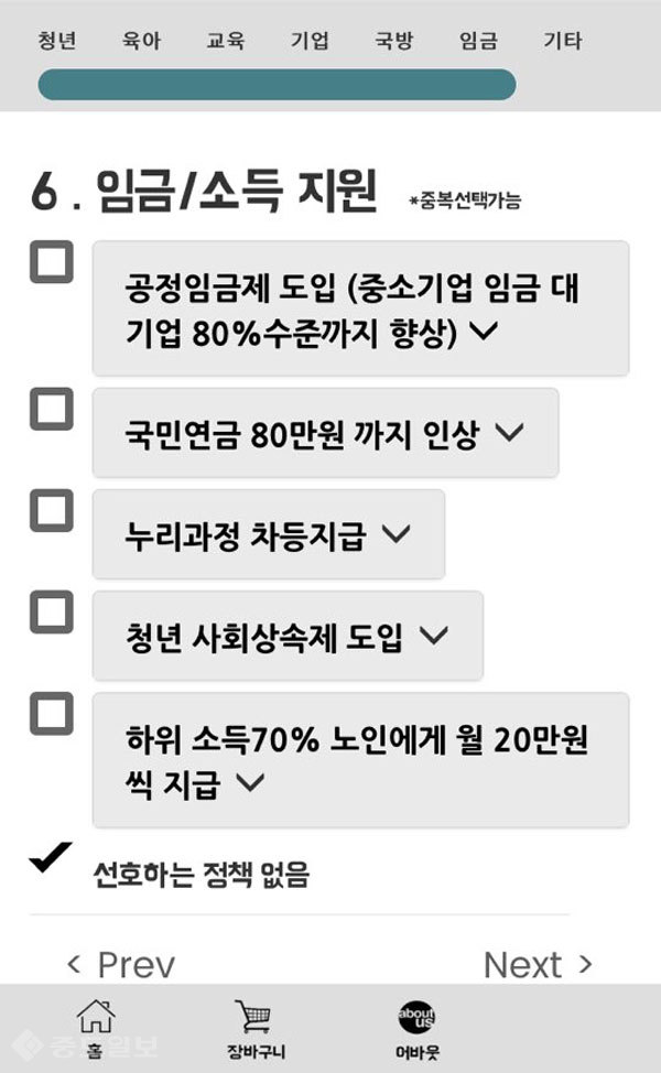 총 7개 분야에 대한 질문으로 구성되어 있으며 자신과 맞는 항목이 없을 경우 '선호하는 정책 없음' 을 선택해도 된다. 각 항목을 누르면 간단한 설명을 볼 수 있다.
