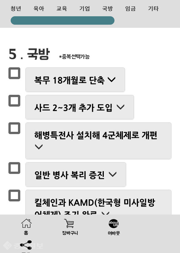 5번에서는 요즘 가장 뜨거운 이슈인 국방에 대해서도 각 후보들의 공약을 알 수 있다.