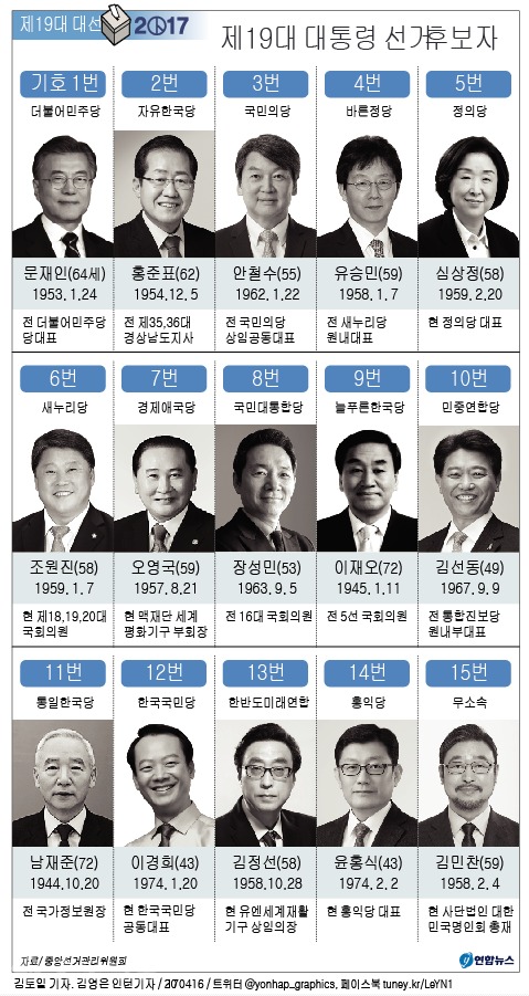 대한민국을 이끌어갈 대통령 선거가 5월 9일에 실시되는데 후보는 15명이다.