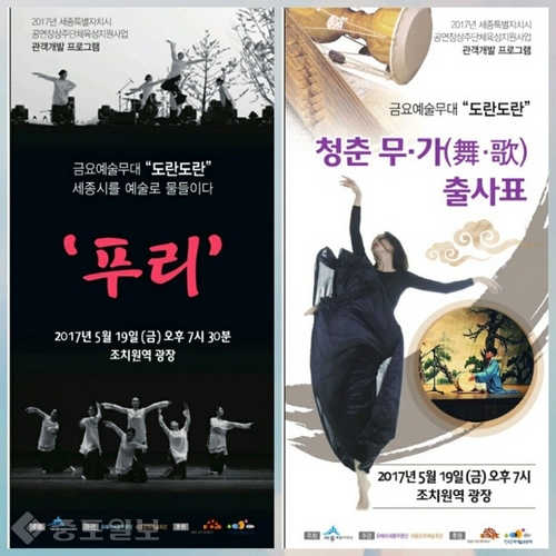 오는 19일 오후 7시와 7시30분 조치원역 광장에서 두 번의 공연이 연이어 열리는데, 첫 공연으로 선보이는 금요예술무대 ‘도란도란, 청춘무·가(無·歌)출사표’는 눈부시도록 푸른 젊은 예술인들의 혼과 열정이 느껴지도록 기획했다.