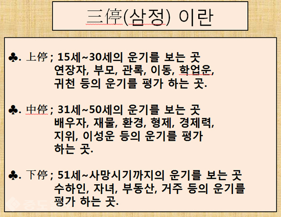 그래서 三停(삼정)이 균등하고 방정하게 생기고 조화를 잘 이루었다면 인생행로도 순조롭게 잘 흘러갈 것이나 어느 한 부분이 너무 부족하거나 너무 넓게 생겼다면 초년, 중년, 말년의 운기도 순탄하지 못하고 좋지 않은 것이다.