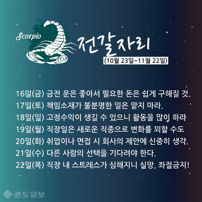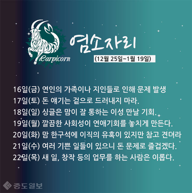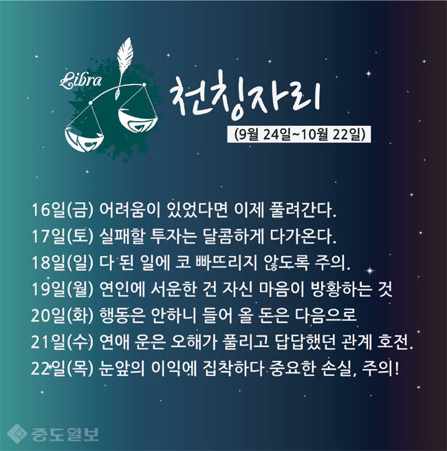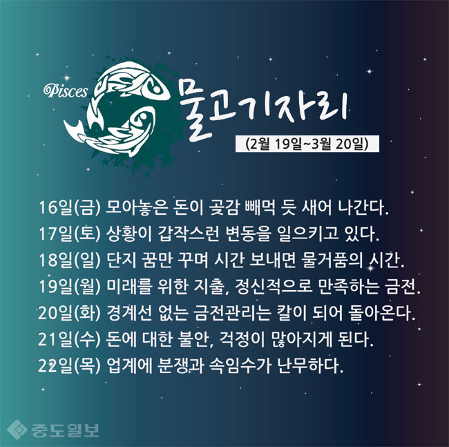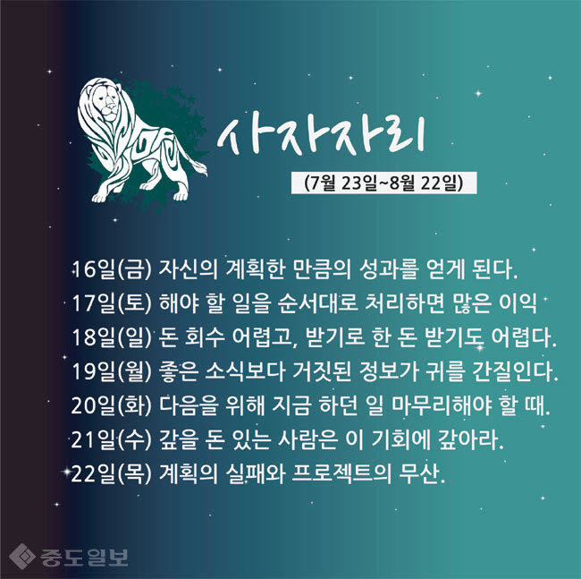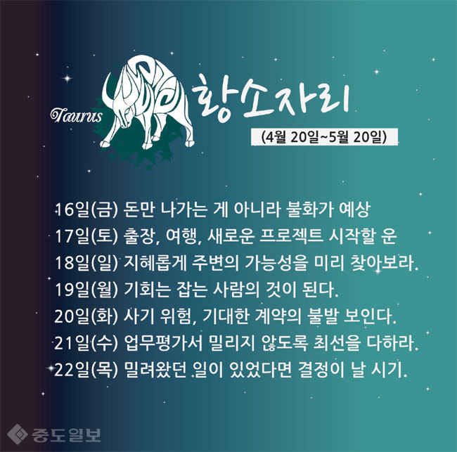 16일(금) 금전 운은 좋아서 필요한 돈은 쉽게 구해질 것.
