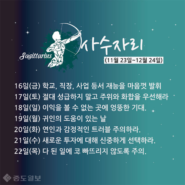 16일(금) 학교, 직장, 사업 등서 재능을 마음껏 발휘