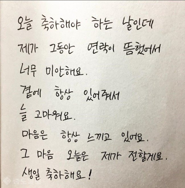 해당 사진에는 "오늘 축하해야 하는 날인데 제가 그동안 연락이 뜸해서 너무 미안해요"라고 자필로 적혀있다.