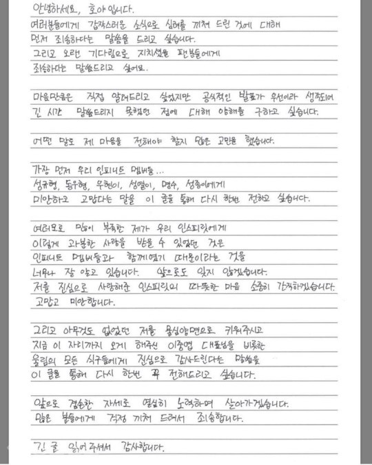 호야는 30일 자신의 인스타그램을 통해 장문의 편지가 찍힌 사진을 게재했다. 사진 속 편지의 내용은 인피니트를 탈퇴한 것에 대한 부분이다.