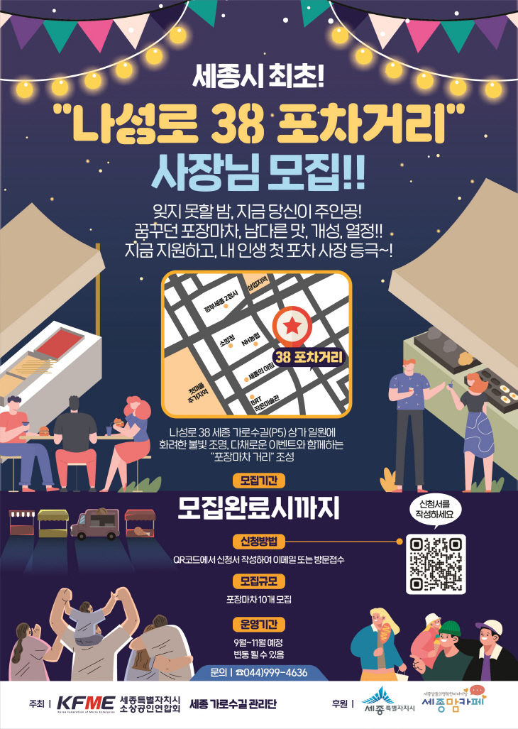 | 세종시 소상공인연합회와 세종 가로수길 관리단이 공실 해소의 자구책으로 마련한 '38 포차 거리' 운영자 모집 포스터. 사진=연합회 제공. |
