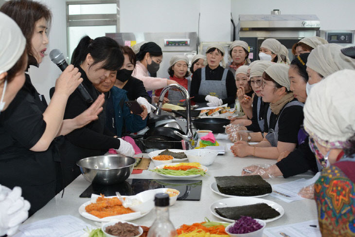 | 전남 신안군이 최근 신안군농산물가공센터에서 제3회 신안세계김밥페스타 판매 김밥 기술전수 교육을 진행하고 있다./신안군 제공 |