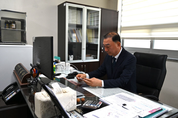 | 안동순 대표이사가 보고서를 검토하며 업무를 수행하고 있다. |