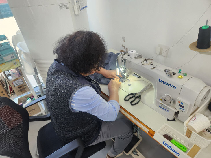 | 28일 구멍난 노동자 작업복을 재봉틀로 꿰매는 모습 (사진=정바름 기자) |