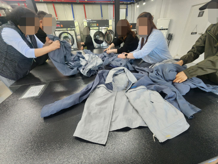 | 28일 노동자 작업복 전문 세탁소 '덕구클리닝'의 근로자들이 수거해온 작업복을 세탁하기 위해 분류 중인 모습 (사진=정바름 기자) |