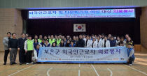보은군은 22일 국민체육센터에서 결혼이민자와 가족, 외국인 근로자 등 100여 명을 대상으로 열린 의료봉사 활동을 성황리에 마쳤다. 이번 의료봉사는 외교부와 보건복지부 공무원 노동조합이 주관하고, 보건복지부·동작구보건소·한국국제보건의료재단·경희대학교 의료원으로 구성된..