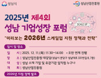 성남산업진흥원은 '2026년 스케일업 지원 정책'을 주제로 11일 11시 30분부터 2025년 제4회 '성남기업성장포럼'을 개최한다. 포럼은 2024년 9월 첫 포럼 개최 이후, 매회마다 참석자가 증가하여 10월 제3회 포럼에는 170여명의 기업 임직원과 10여개 기업..
