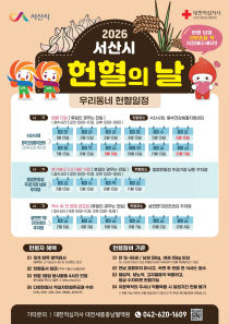충남 서산시가 헌혈 기부 문화 정착과 안정적인 혈액 수급을 위해 '2026년 헌혈의 날'을 운영한다고 밝혔다. 12일 서산시에 따르면 헌혈의 날은 매월 13일 오전 10시부터 오후 4시까지 서산시청과 동부건강생활지원센터에서 정기적으로 진행된다. 여기에 더해 2월·5월·..