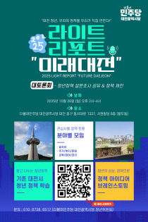 더불어민주당 대전시당 청년위원회가 26일 오후 2시 대전시당 대회의실에서 '라이트리포트 미래대전 청년 대토론회'를 개최한다. 토론회는 대전 청년정책을 평가하고 2026년 정책 방향을 함께 제안하기 위한 자리다. 이 자리에서는 청년정책 설문조사 결과를 공유하고 분야별 토..