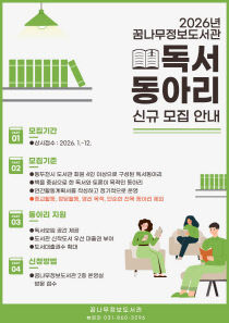 동두천시 도서문화사업소 꿈나무정보도서관은 시민들의 인문적 사고력 향상과 토론 문화 활성화를 위해 2026년 신규 독서동아리를 모집한다고 밝혔다. 독서동아리는 독서 토론과 서평 쓰기, 추천 도서 읽기 등 책을 매개로 한 다양한 활동을 함께하는 모임이다. 참여 회원에게는..