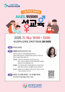 부산교육청이 AI 시대 자녀의 건강한 성 가치관 형성을 돕기 위한 학부모 특강을 마련한다. 부산시교육청은 학부모의 올바른 자녀 교육관 정립과 부산교육 정책 이해를 돕기 위해 '11월 학부모 행복학교'를 운영한다고 밝혔다. 이번 행복학교는 'AI 시대, 우리아이 성교육'..