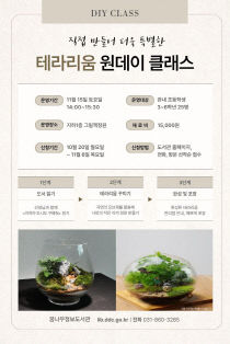 동두천시 도서문화사업소 꿈나무정보도서관은 오는 10월 20일부터 초등학교 3~6학년을 대상으로 '테라리움 만들기' 원데이 클래스를 운영한다고 밝혔다. 참가 신청은 도서관 홈페이지를 통해 선착순 25명을 모집하며, 프로그램은 11월 15일 오후 2시부터 3시 30분까지..
