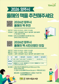 양주시가 11월 14일까지 2026년 양주시 '올해의 책'을 추천받는다. 2026년 양주시 『올해의 책』 선정은 시민들의 참여로 선정한 도서를 다양한 연계 프로그램을 통해 함께 읽고 소통하는 등 독서 문화를 확산시키기 위해 추진된다. 양주시 올해의 책은 ▲그림책, ▲어..