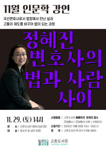 김포시 고촌도서관은 11월 29일 오후 2시부터 4시까지 '법과 사람 사이' 강연을 운영한다. 강연자는 정혜진 변호사로, 국선변호사로 활동하며 법정에서 마주한 다양한 삶과 사건, 그리고 실제로 '이름이 법이 된 사례'들을 시민들과 나눌 예정이다. 정 변호사는 그간의 경..