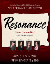 Resonance 공명-'Frem Bach to War' 바흐에서 전쟁까지 제12회 '피아노앙상블' 정기연주회가 3월 8일 일요일 19:00 대전예술의전당 앙상블홀에서 성황리에 개최됐다. 이번 공연은 '앙상블피아노소리' 고은정, 구혜진, 김영미, 최은성 총4명의 피아니..