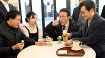 김민석 국무총리가 28일 대전 중구 대흥동 제과 상점가를 방문해 빵과 젤리, 푸딩 등을 시식하고 상인들과 간담회를 갖고 있다. 이성희 기자 token77@