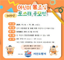 서산소방서(서장 최장일)는 11월 불조심 강조의 달을 맞아 '2025년 어린이 불조심 손그림 포스터 공모전'을 개최한다고 6일 밝혔다. 이번 공모전은 오는 11월 25일까지 20일간 진행되며, 서산 관내 초등학생 및 12세 이하 어린이라면 누구나 참여할 수 있다. 공모..