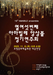 보령시가 지역 대표 연주단체인 아마빌레 앙상블의 제16회 정기연주회를 8일 보령문화예술회관 대공연장에서 개최한다고 5일 발표했다. 이번 공연은 지역 문화예술 발전과 시민들의 문화 향유 기회 확대를 목적으로 기획됐으며, 오후 4시부터 약 80분간 무료로 진행된다. 관객들..