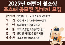 충주소방서는 11월 '불조심 강조의 달'을 맞아 충주지역 어린이들을 대상으로 '2025년 어린이 불조심 포스터 공모전' 참가자를 모집한다고 3일 밝혔다. 이번 공모전은 어린이들이 화재의 위험성과 예방의 중요성을 스스로 배우고 익히며, 생활 속 안전문화를 확산하기 위해..