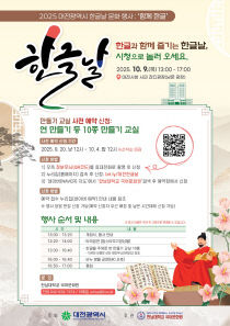 대전시는 579돌 한글날을 맞아 기념 문화행사 '함께 한글'을 10월 9일 오후 1시부터 대전시청 남문광장(시민 잔디광장)에서 개최한다. 18일 대전시에 따르면 이번 행사는 대전시가 주최하고 한남대학교 국어문화원이 주관하며, 한글의 창의성과 과학성을 널리 알리고 우리말..