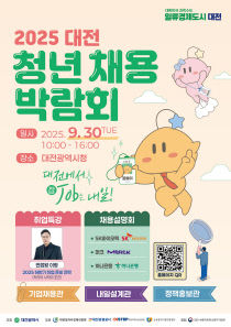 대전시는 30일 오전 10시부터 오후 4시까지 시청 2~3층에서 '2025 대전 청년채용박람회'를 개최한다고 22일 밝혔다. 이번 박람회는 대전일자리지원센터를 중심으로 지역 대학, 공공기관과 협력해 마련된 맞춤형 채용행사로, 청년 구직자는 물론 외국인 유학생, 폐업 소..