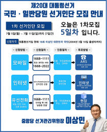 더불어민주당 대선 후보 선출을 위한 예비경선 여론조사를 9일부터 11일까지 한다. 민주당 선거관리위원회에 따르면 선거관리위원장은 이상민 의원(유성을)이 맡고 있으며, 여론조사 반영 비율은 일반 국민 50%, 민주당 당원 50%다. 여론조사 투표가 끝나는 11일 오후 5..