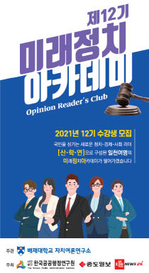 충청권 대표 정치사관학교이자 정치인 양성소인 '미래정치 아카데미'(미정아)가 12기 수강생을 모집한다. 101명을 선착순으로 모집하며 등록 마감은 9월 2일까지다. 미정아는 2009년부터 지역사회 오피니언 리더를 양성하고 다수의 자치단체장과 지방의회 의원, 기관장 등을..